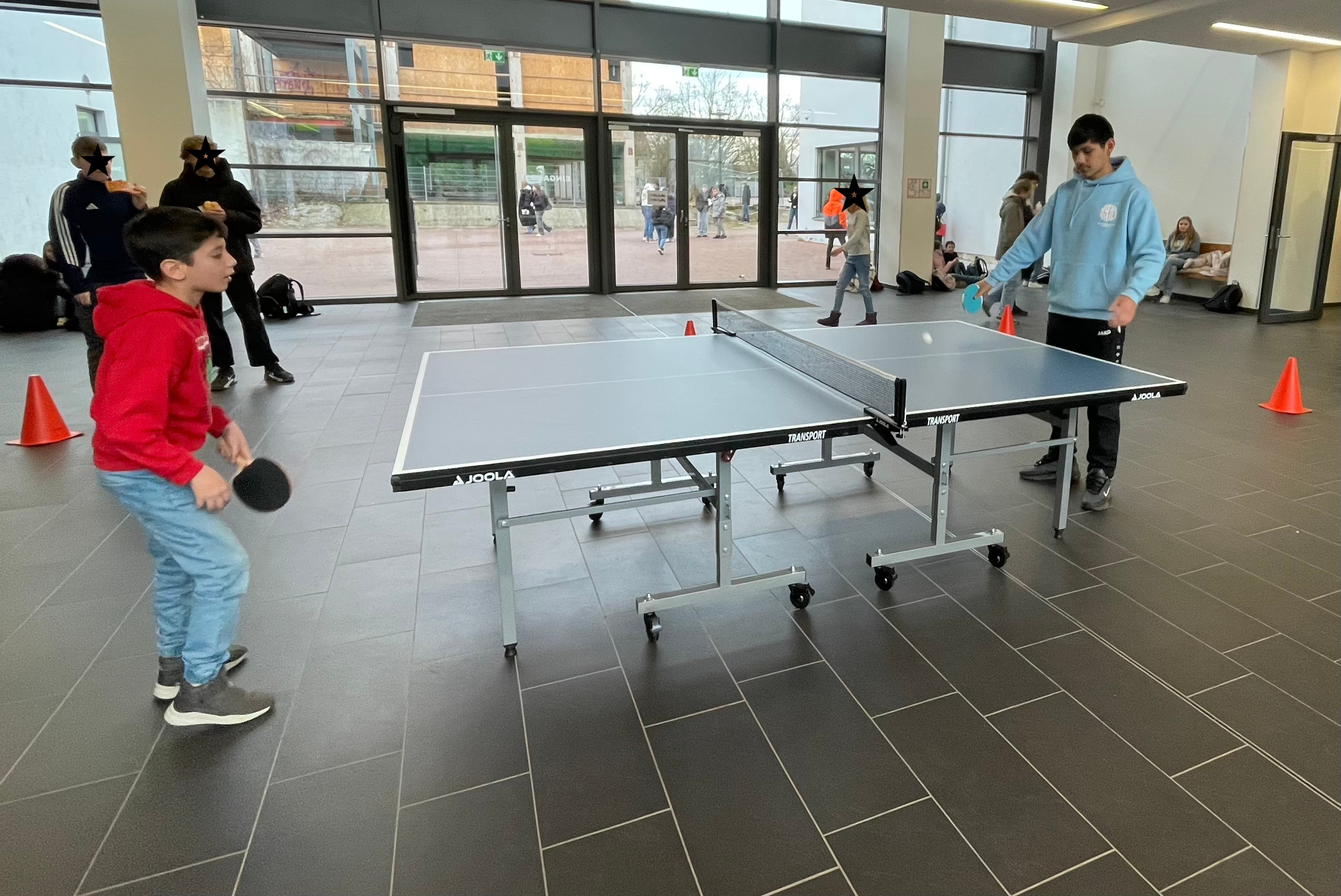 Eine weitere Initiative ist die Anschaffung einer Indoor-Tischtennisplatte, die der Schülerschaft in den Regenpausen in der Aula zur Verfügung steht. Die Sporthelfer haben die Aufgabe, den Auf- und Abbau der Platte zu organisieren, Regeln zu erklären sowie darauf zu achten, dass alle Beteiligten fair und respektvoll miteinander umgehen.