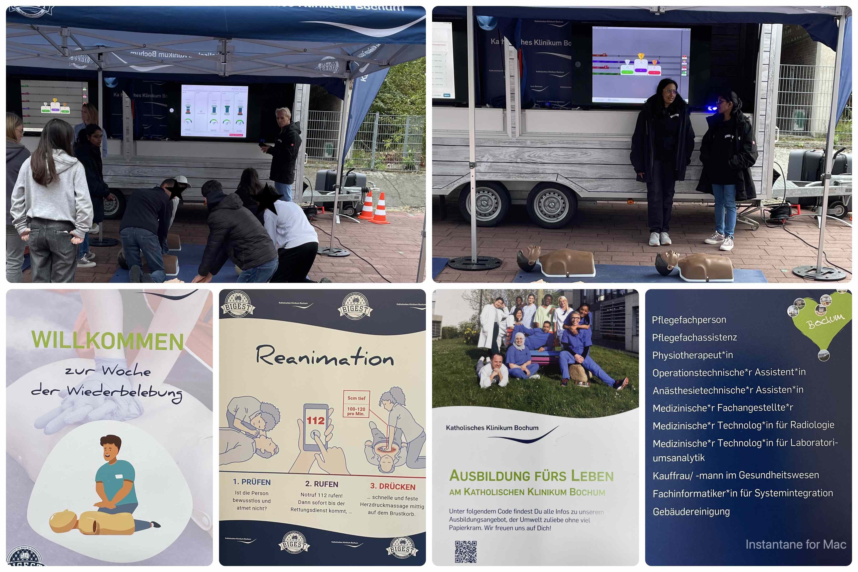In einem mobilen Reanimations-Center des Klinikums konnten Schülerinnen und Schüler um die Wette drücken, wobei es hier auf den richtigen Rhythmus und die korrekte Tiefe beim Drücken an der Versuchspuppe ankam. An einer weiteren Station wurde das richtige Verhalten beim Auffinden einer leblosen Person erklärt und die Schülerinnen und Schüler erkannten, wie einfach Helfen oder das Absetzen eines Notrufs eigentlich ist.